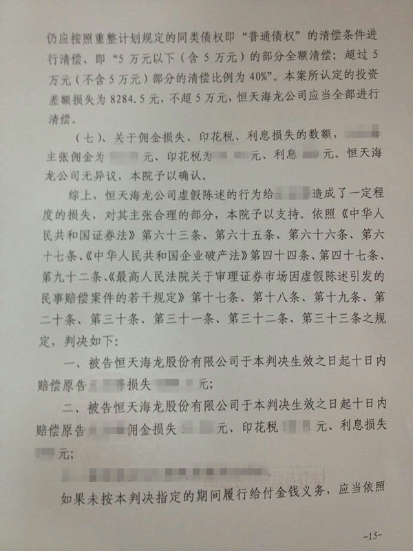 近日,由上海明伦律师事务所王智斌律师代理的投资者诉恒天海龙(000677)虚假陈述责任纠纷一案取得胜诉判决,济南市中级人民法院判决上市公司向投资者承担赔偿责任,详见以下判决书(节选):