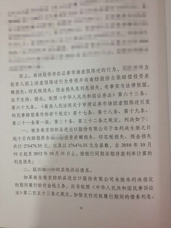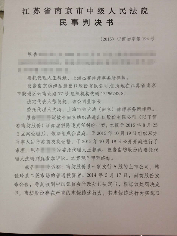 近日,上海明伦律师事务所王智斌律师(原上海杰赛律师事务所)代理的投资者诉南纺股份虚假陈述案获得胜诉判决,以下为判决书(节选),涉及当事人个人信息的部分已做马赛克处理。