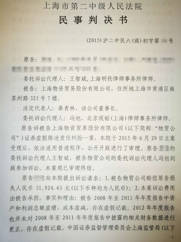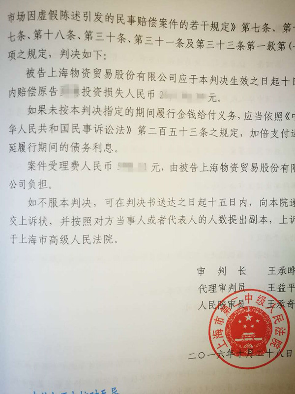 上海物贸(600822)虚假陈述案胜诉