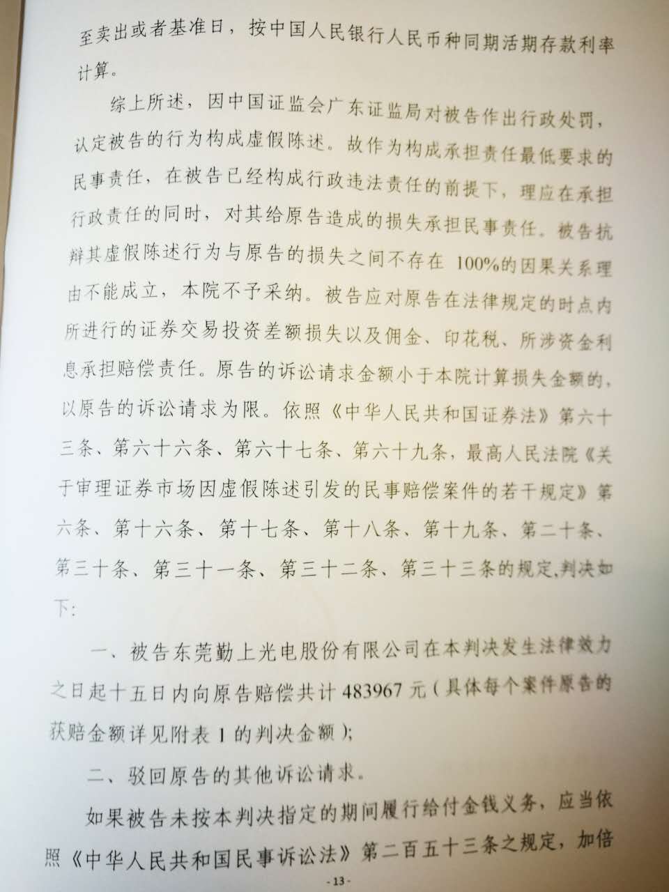 我们代理的投资者诉勤上光电虚假陈述案获得胜诉判决,部分投资者损失获得近100%赔偿,详见如下判决书(节选):