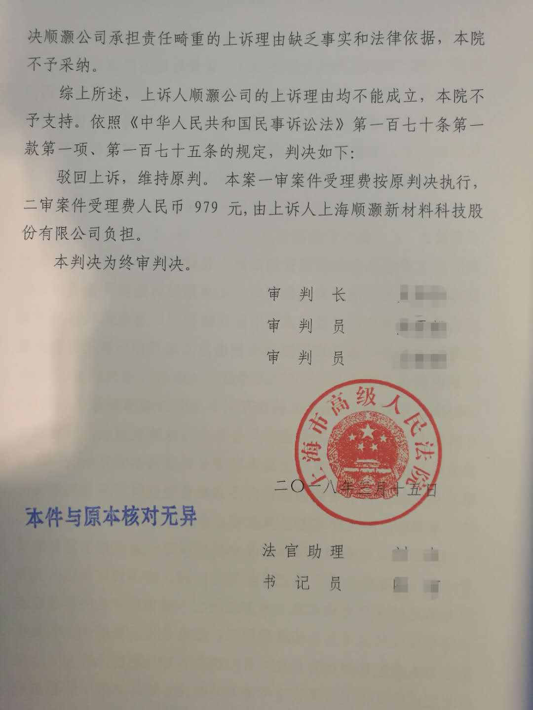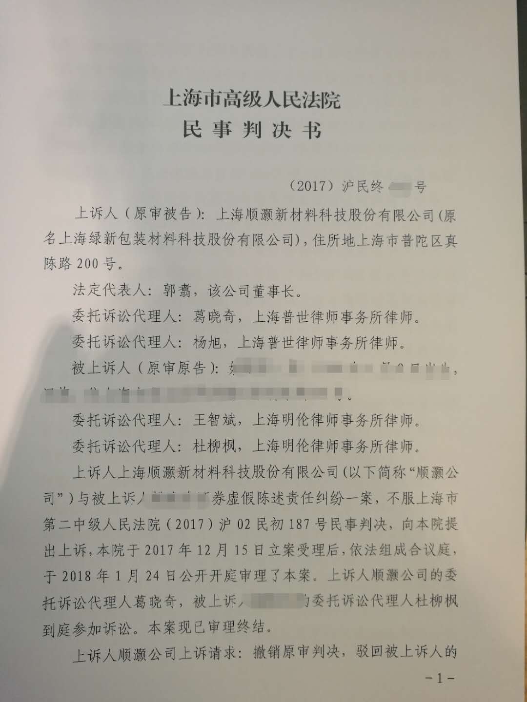 近日,收到上海市高级人民法院终审判决书,投资者诉顺灏股份(原上海绿新,002565)一案,终审胜诉。