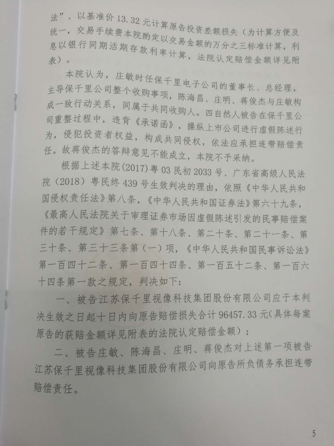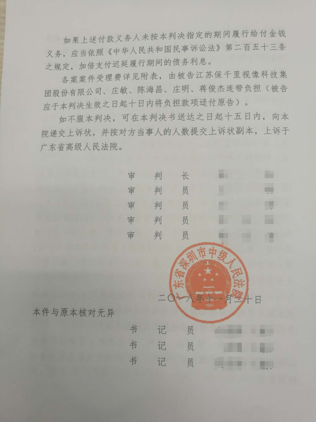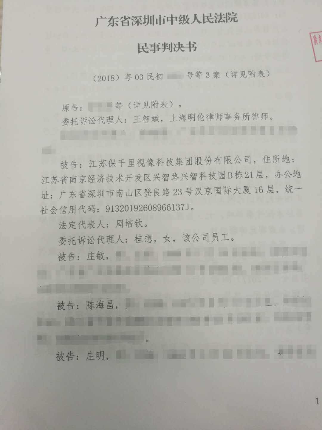 近日,收到深圳市中级人民法院一审判决书,投资者诉保千里(600074)一案,一审胜诉。