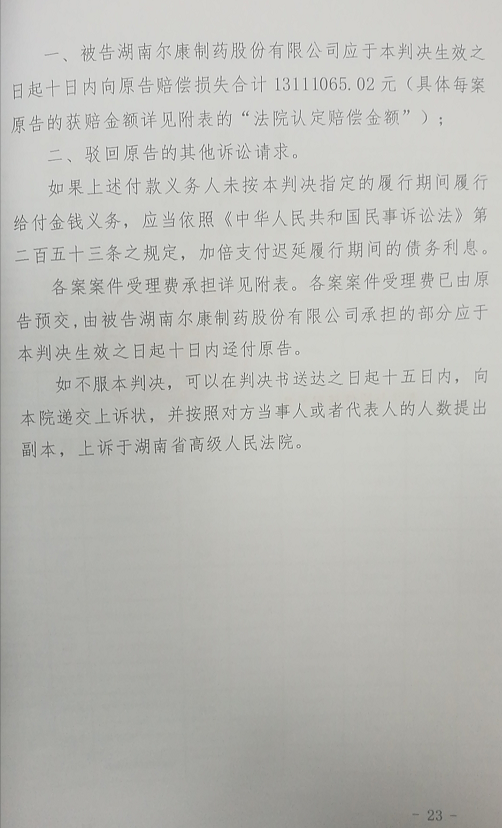 目前部分投资者已提起上诉,尔康制药方面也对部分案件提起上诉,案件将进入二审。