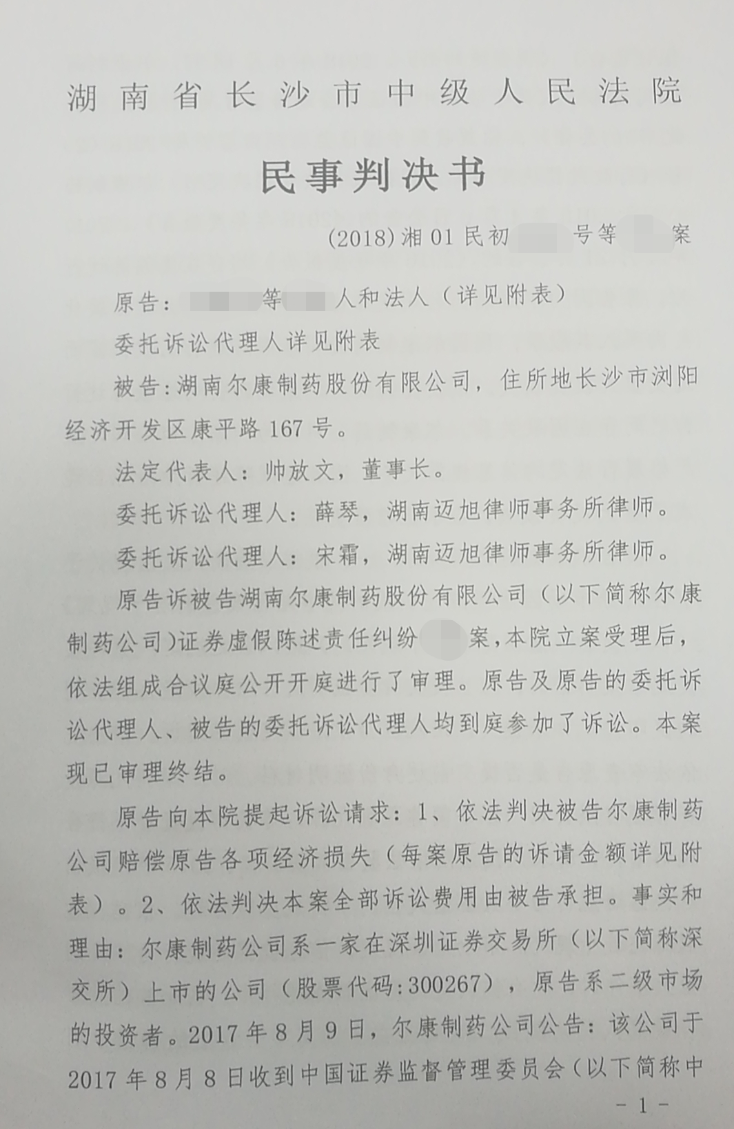 长沙市中级人民法院对尔康制药案作出一审判决,部分投资者胜诉,但是由于法院大幅调整了可索赔的范围,导致很多投资者被一审法院排除在索赔范围之外。