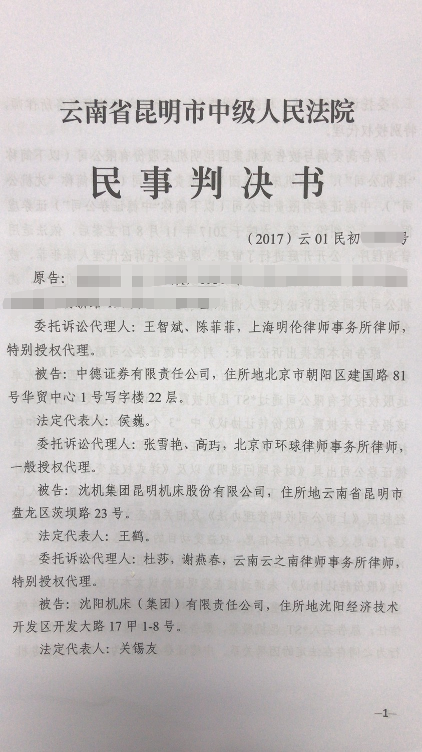 近日,收到昆明中院出具的一审判决书,昆机投资者诉中德证券股票索赔系列案一审胜诉。