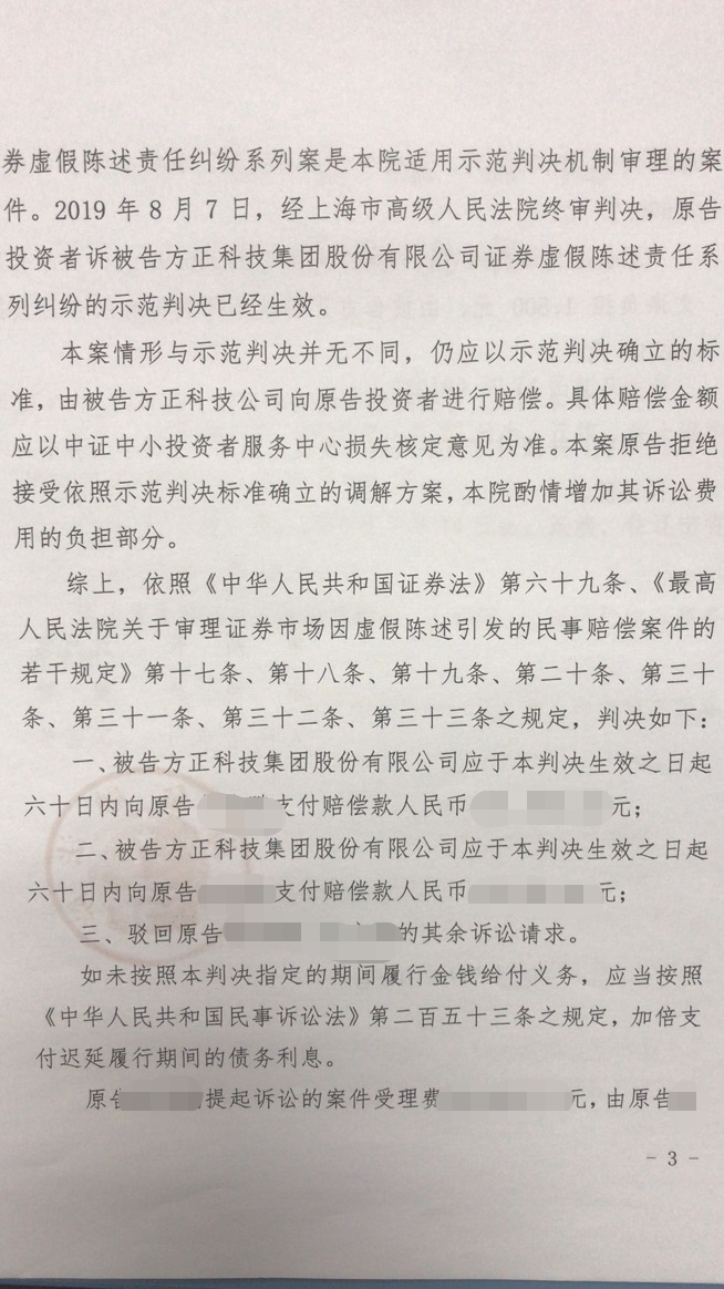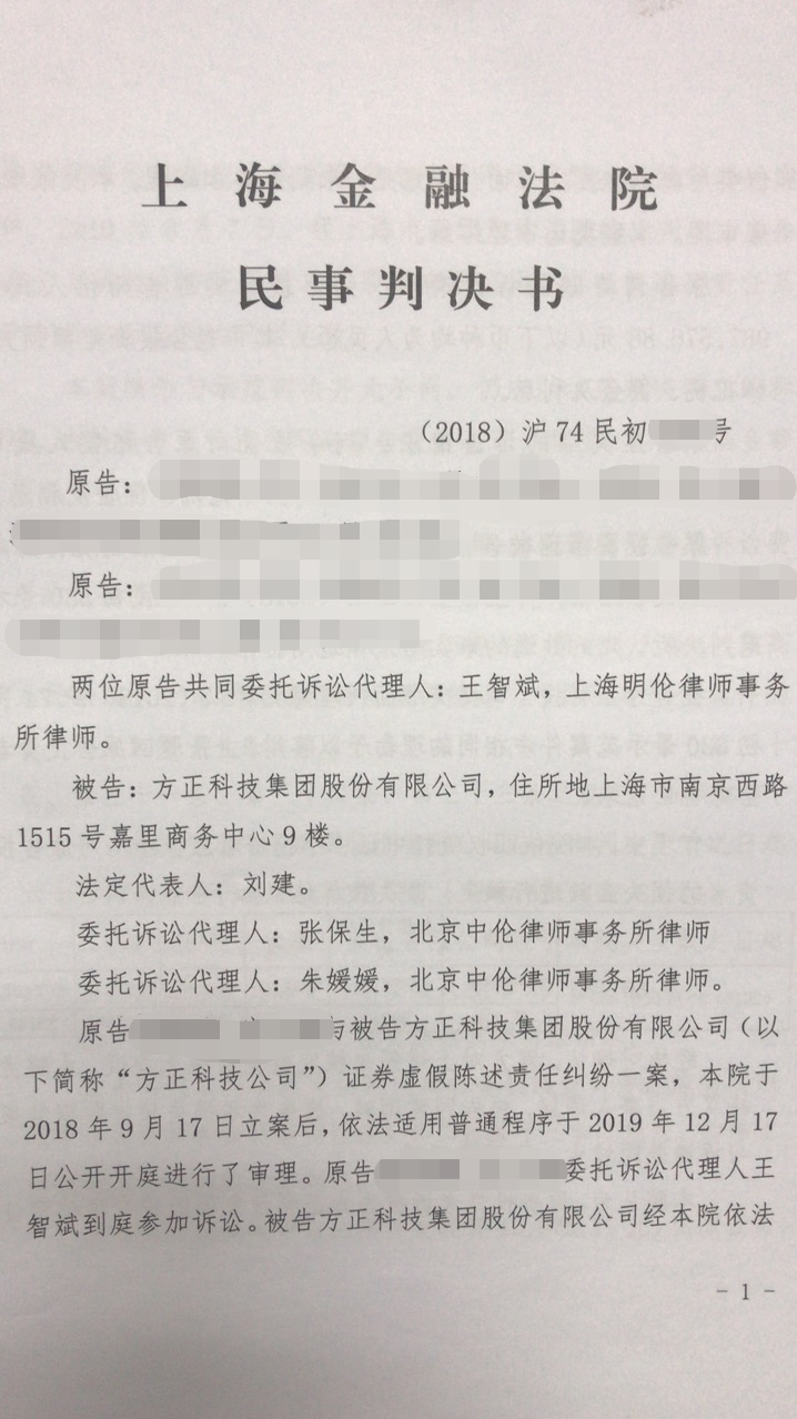 上海金融法院对方正科技案作出一审判决,我方所代理投资者胜诉。