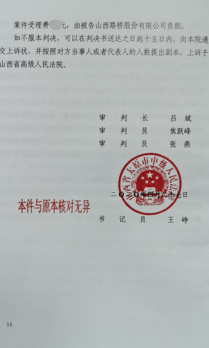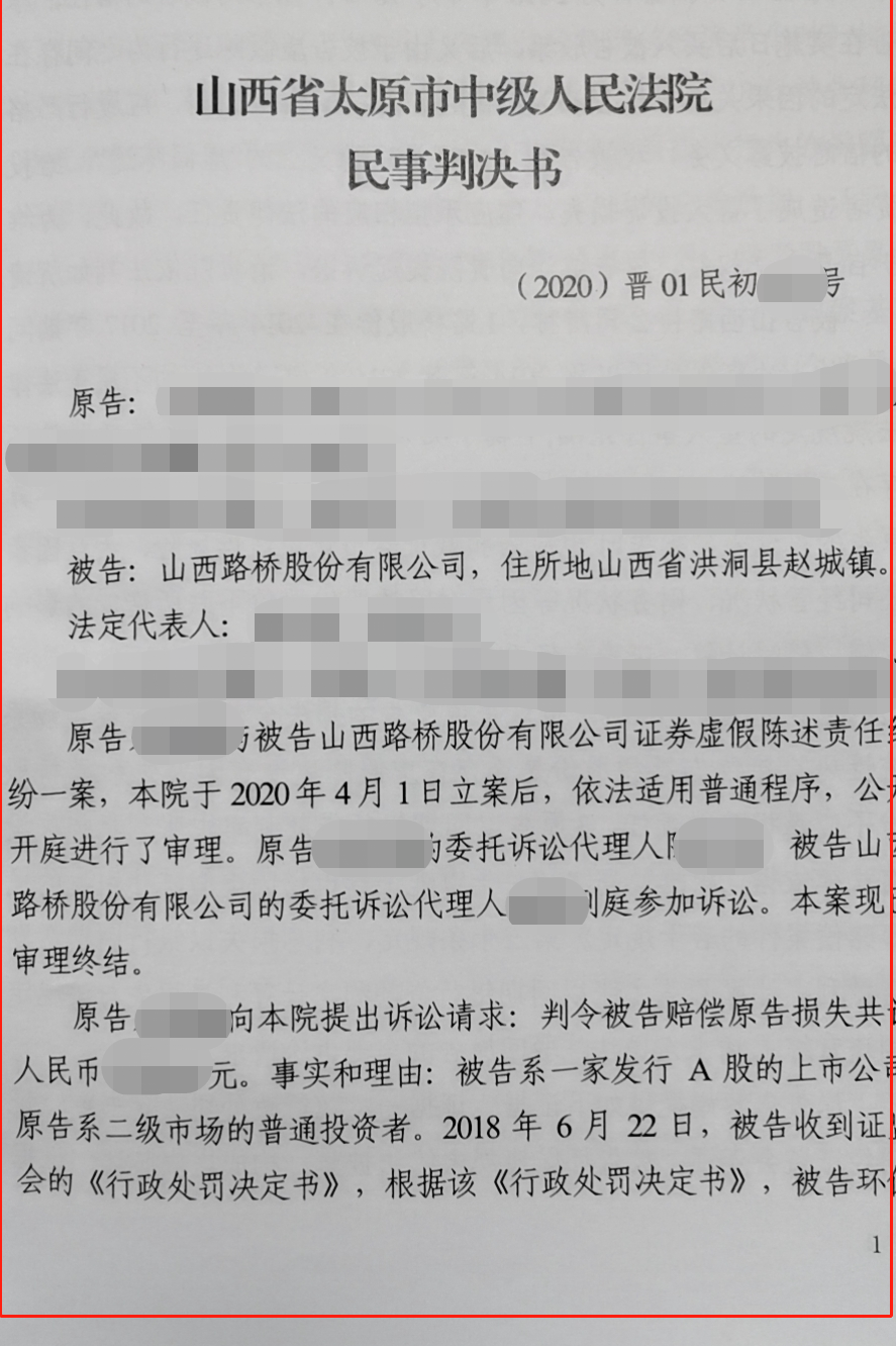 近日,收到太原市中级人民法院一审判决书,投资者诉山西路桥(原:山西三维)虚假陈述索赔一案,一审胜诉。