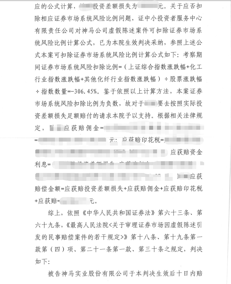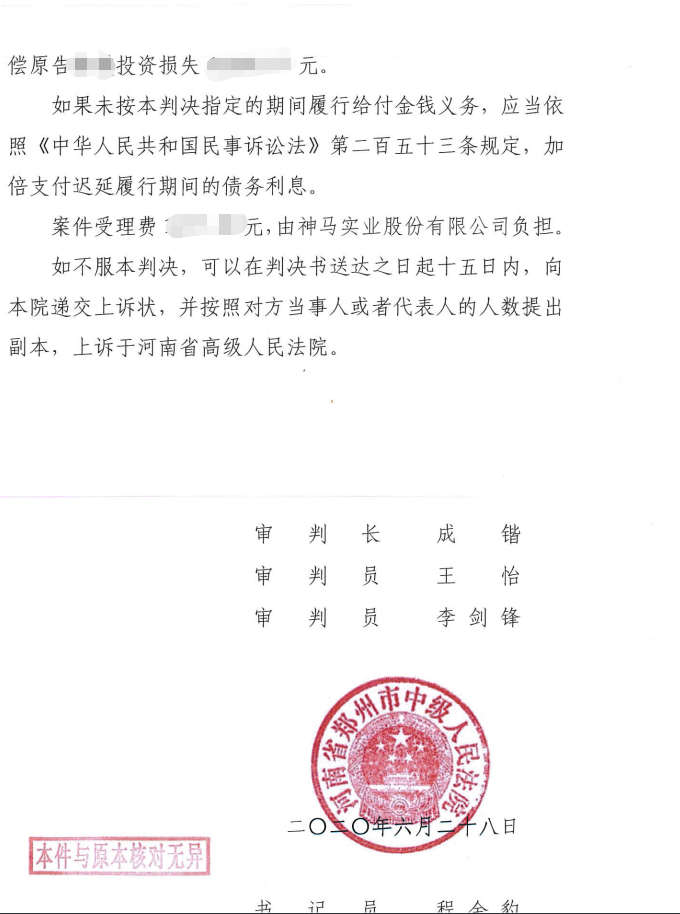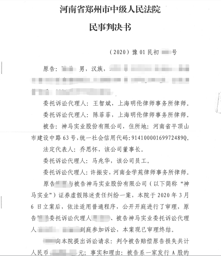 近日,收到郑州市中级人民法院一审判决书,投资者诉神马股份虚假陈述索赔一案,一审胜诉。