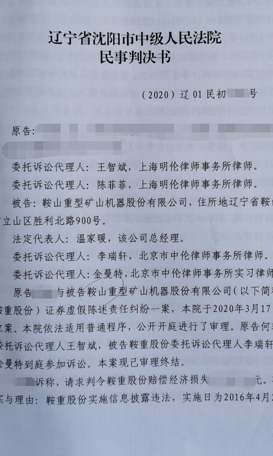 近日,收到沈阳市中级人民法院一审判决书,投资者诉鞍重股份一案,一审胜诉。