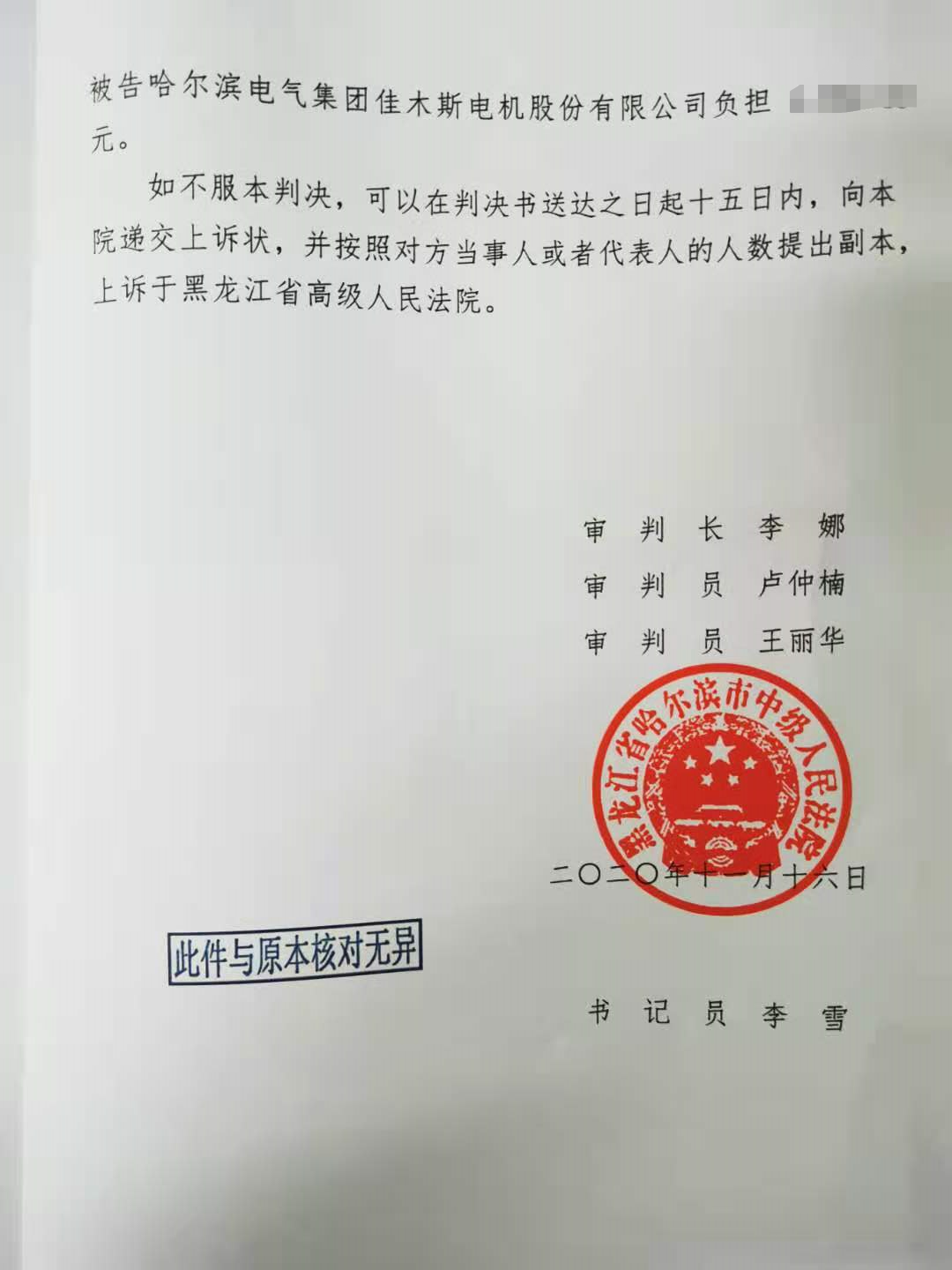 近日,收到哈尔滨市中级人民法院一审判决书,投资者诉佳电股份一案,一审胜诉。