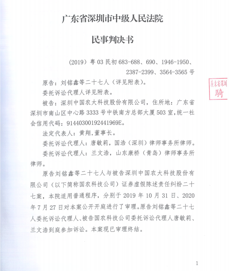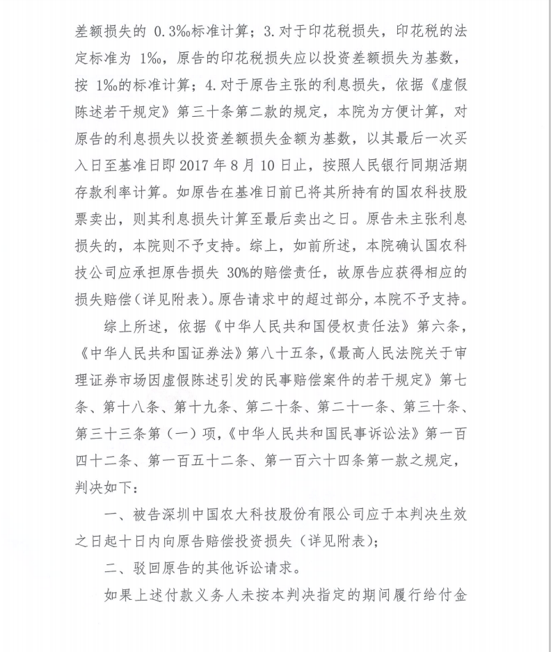 今日,收到投资者诉国农科技证券虚假陈述案判决书,投资者方面胜诉。