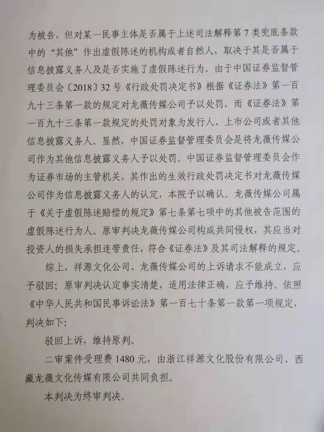 近日,浙江省高级人民法院对我方代理的部分案件作出判决,浙江省高级人民法院驳回了祥源文化的上诉理由,维持原判。我方所代理投资者终审胜诉。