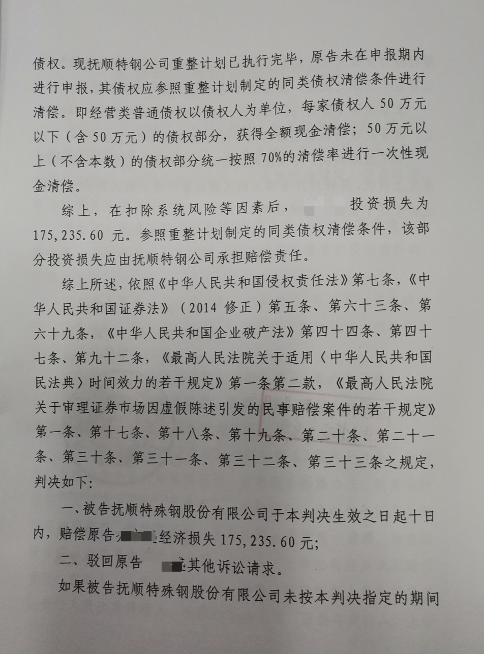 投资者诉抚顺特钢证券虚假陈述索赔系列案,我方已获一审胜诉判决。