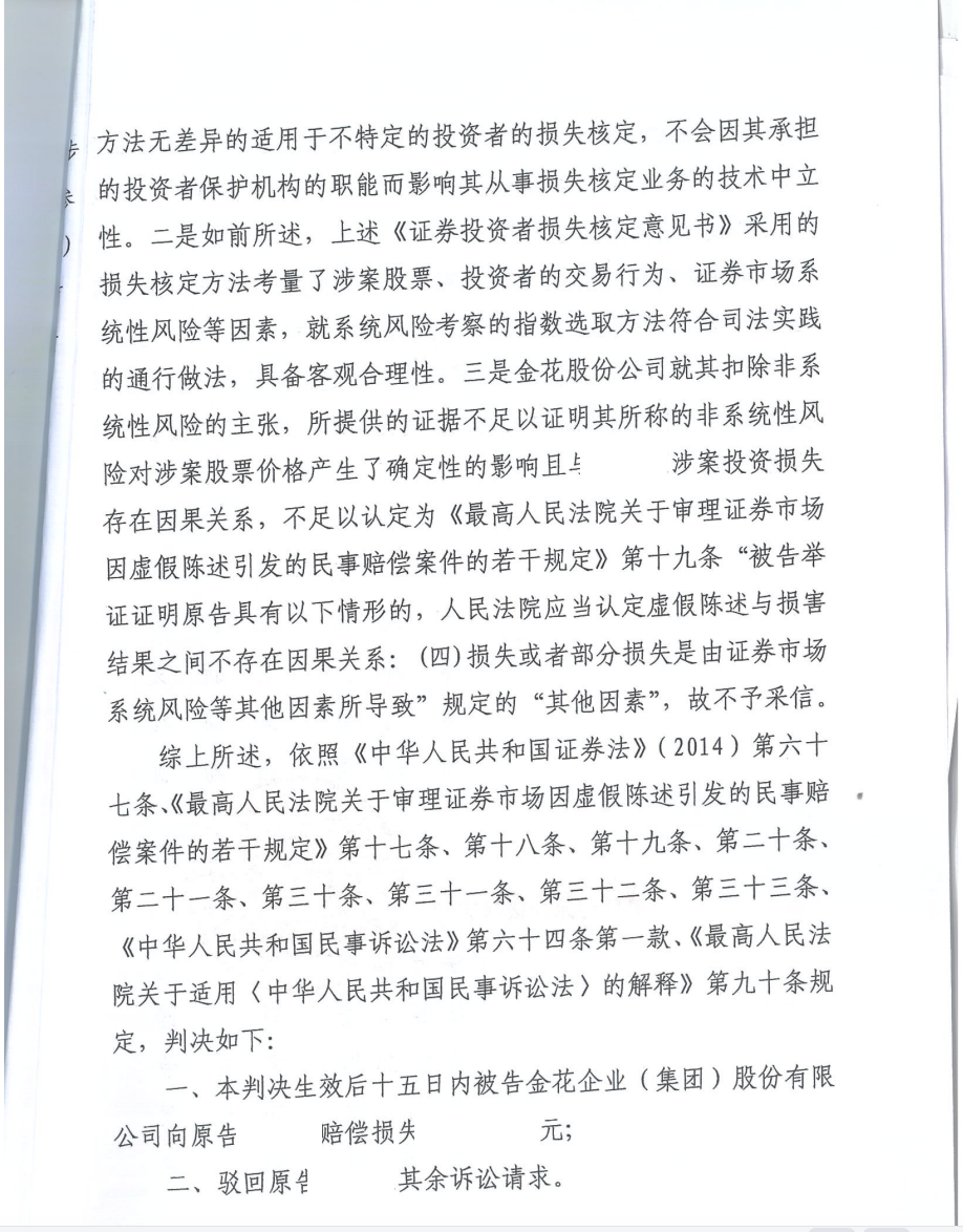 2021年9月13日,投资者诉金花股份证券虚假陈述责任纠纷系列案取得一审胜诉判决,据目前收到的部分判决书来看,投资者诉讼请求得到较高比例的支持,支持率超过80%。