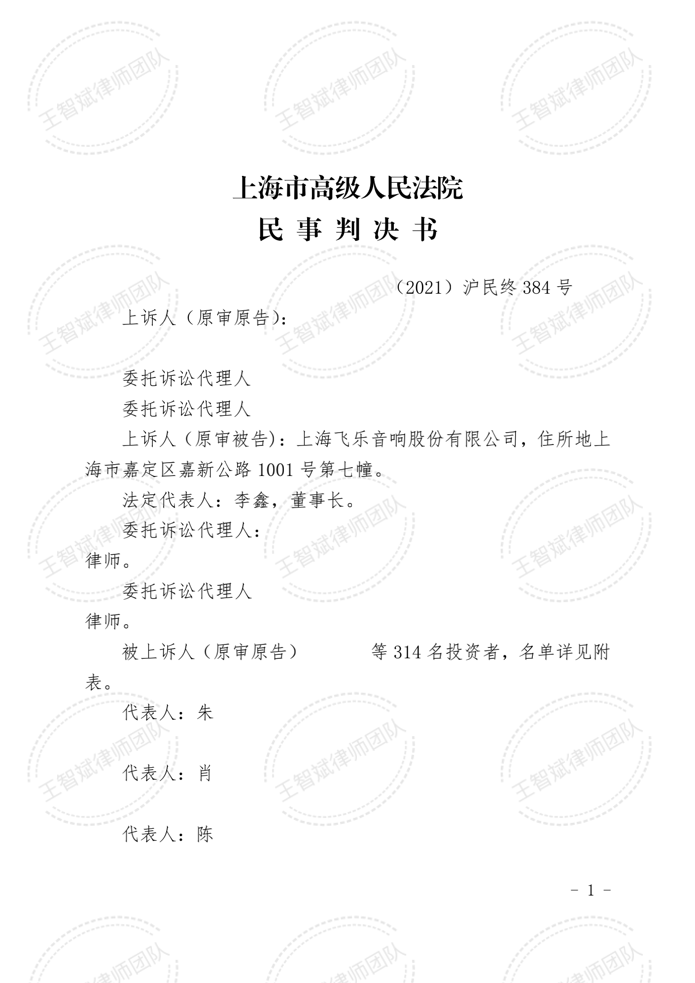 2021年9月29日,投资者诉飞乐音响证券虚假陈述责任纠纷一案,二审尘埃落定。上海市高级人民法院驳回刘某武以及飞乐音响的上诉,维持原判。