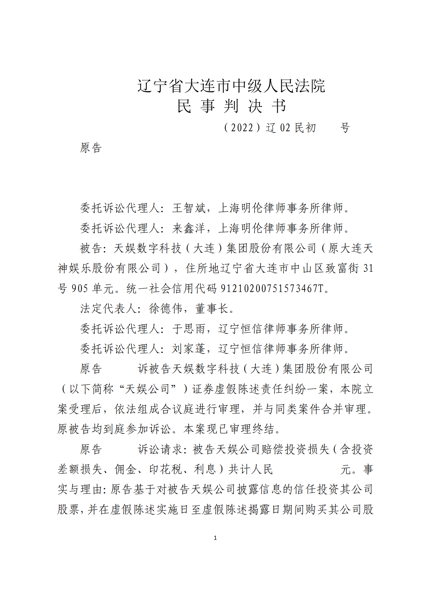 近日,收到辽宁省大连市中级人民法院一审判决书,投资者诉天神娱乐股票索赔系列案获得一审胜诉判决。