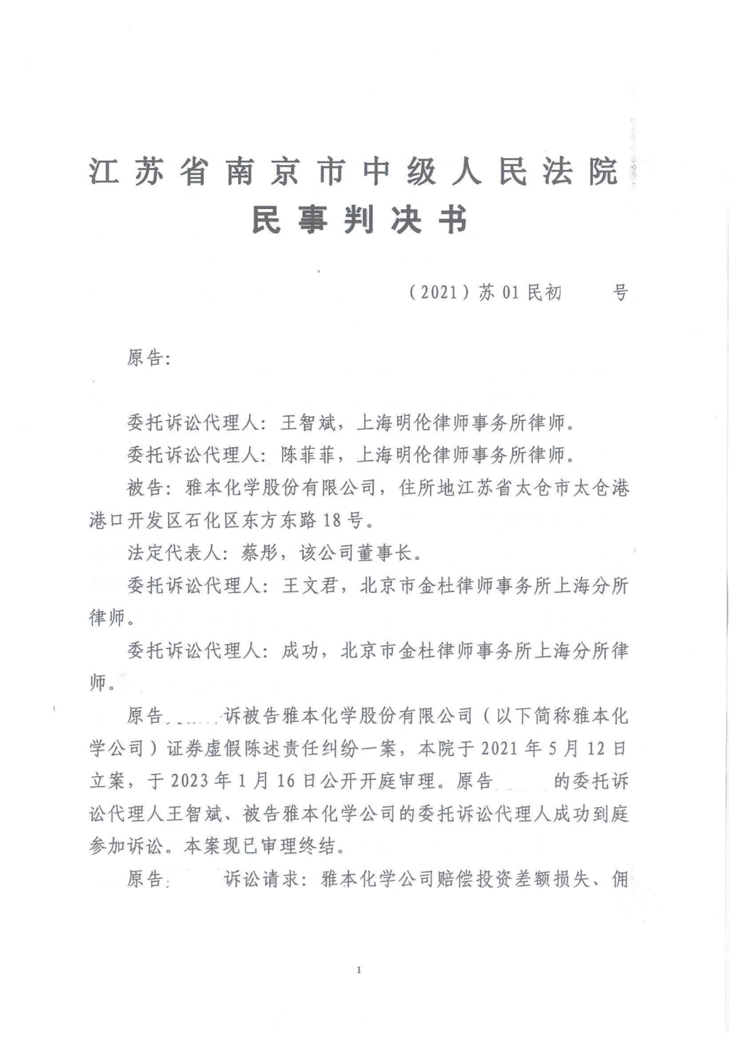 近日,投资者诉雅本化学案获得一审胜诉判决,法院判决雅本化学向首批起诉的投资者赔偿共计194余万元,但这并不是全部,第二批\第三批案件尚待审理和判决.