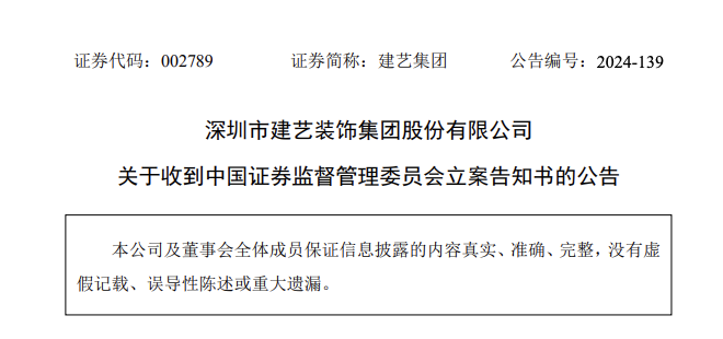 根据建艺集团于2024年12月23日晚间发布的公告,公司收到了中国证监会的《立案告知书》(编号:证监立案字0072024 43号),因涉嫌信息披露违法违规,中国证监会决定对公司进行立案调查。公告中提到,公司将积极配合有关部门的调查,并严格按照相关法律法规的规定和要求履行信息披露义务。目前,公司各项生产经营活动正常开展,所有信息均以指定信息披露媒体刊登的信息为准。