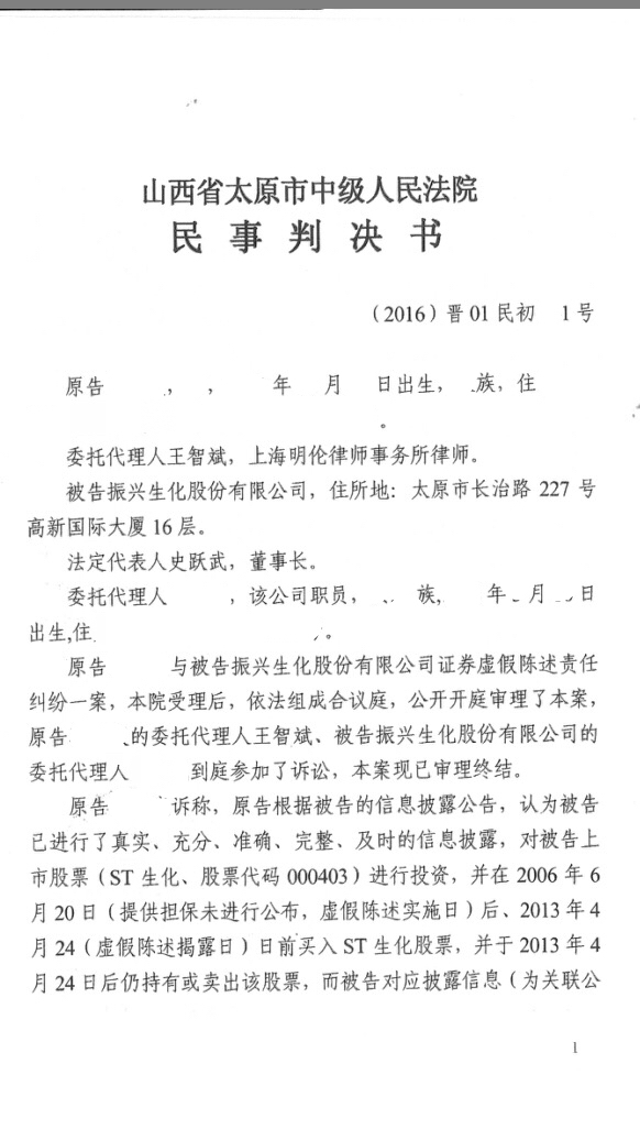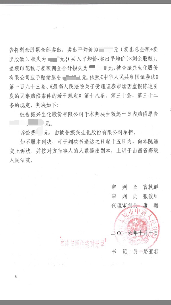 近日,我们代理的投资者诉振兴生化虚假陈述责任纠纷一案,大获全胜,法院判决振兴生化向投资者赔偿损失,赔偿比例为100%。